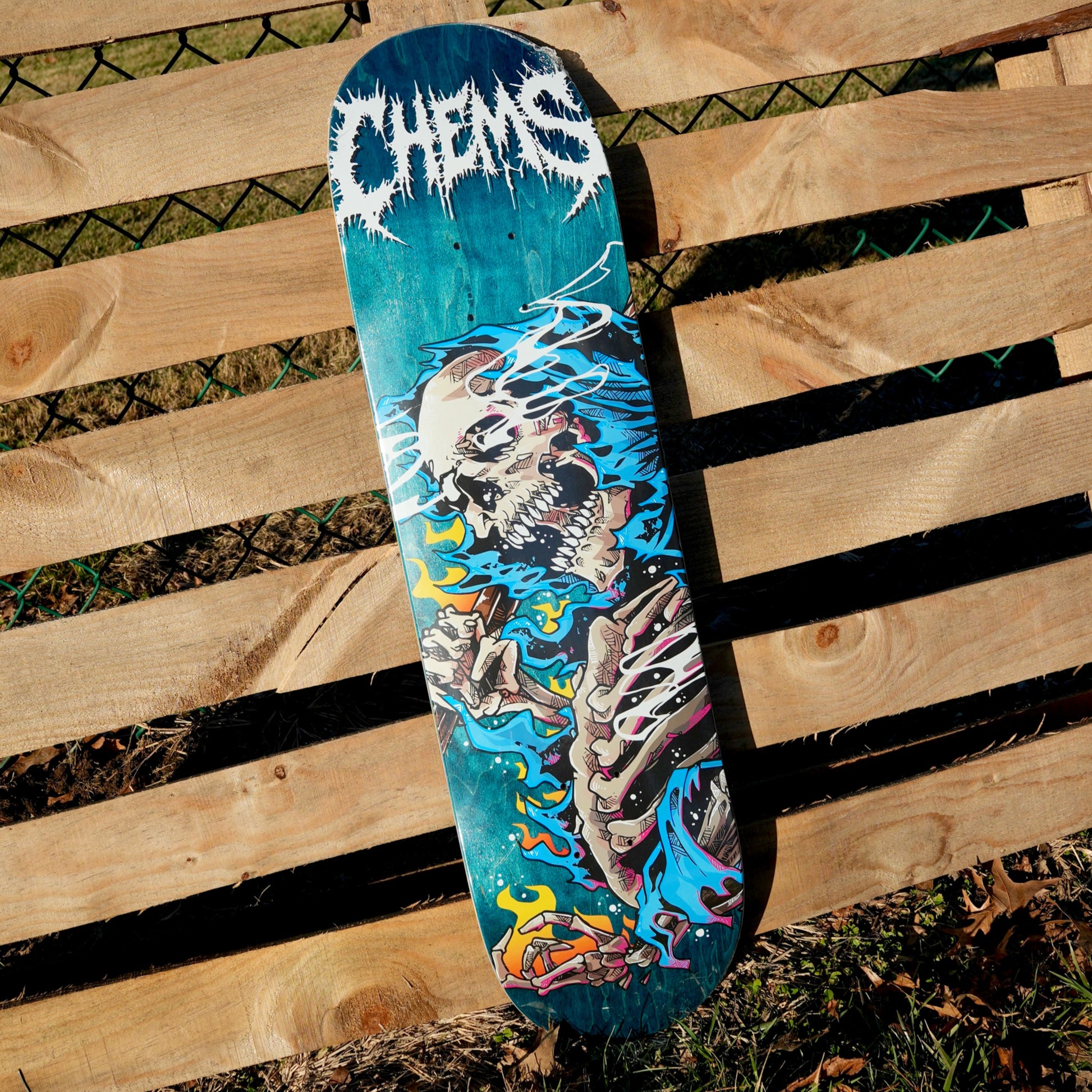 Chems Blue Fire Grim 8.25" Skateboard Deck (Blue Bottom Ply)